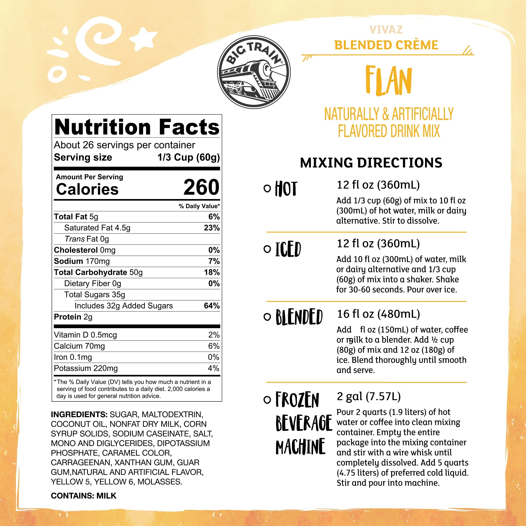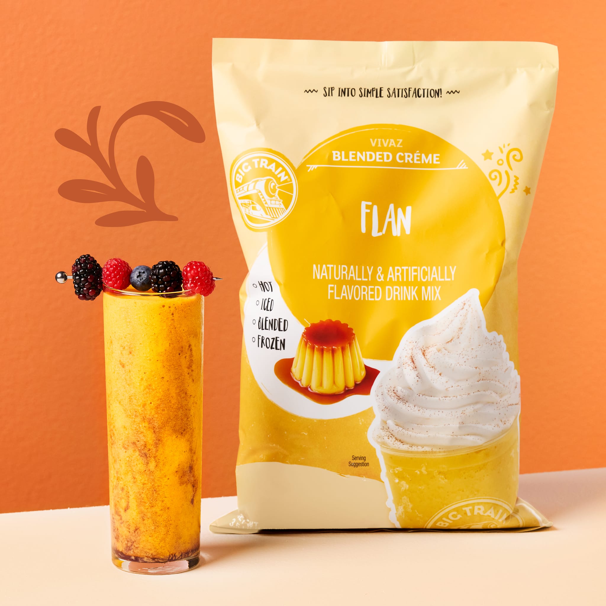 Big Train Vivaz Flan Blended Crème Frappe Mix transforms the iconic Latin dessert into a smooth, creamy beverage experience. With rich caramel notes and a velvety texture, this mix is perfect for creating indulgent drinks that delight. Just add water—no barista skills required—and serve hot, iced or blended. Loved by over 70% of consumers, flan flavor offers broad appeal and high-margin potential. Use it in recipes like wildberry flan frappes or hot cherry flan lattes to add visual flair and flavor innovation. Big Train’s easy-to-use mixes ensure consistent results and premium taste in every cup. Premium, on-trend drinks just got so much easier with Big Train Vivaz Flan Blended Crème Frappe Mix.